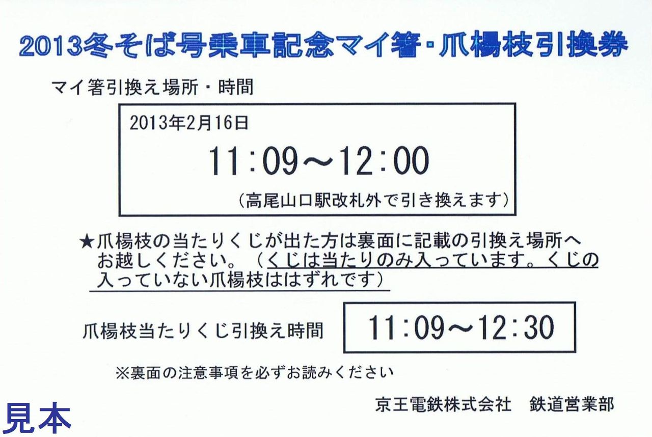 写真は車内で配布された引換券。前年度までと同じくプリンター印刷で裏面にナンバーが付いていますが、東京都交通局からの爪楊枝(当たりくじ付き)が乗車記念品に加わり、くじの当選者向けの案内も追加されたためかサイズがハガキサイズになりました。〔京王電鉄 2013冬そば号乗車記念マイ箸〕