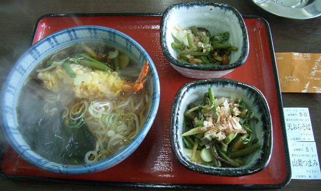 次はそばを食べるために移動します。当日は仕事仲間と午前3時まで飲んでいたのでアタマを冷やす為に行きはリフト。帰りはケーブルカーにします。ケーブルカー高尾山駅前の高尾登山電鉄直営店『香住』で天ぷらそば(780円。写真右の左側)・山菜つまみ(350円。写真右の右下にある小鉢)を食べました。尚、京王電鉄各駅で配布されている『高尾山そばマップ』を持参するとキャンペーン参加店舗で100円引きとなるクーポンが付き、香住では割引対象(食券購入後100円キャッシュバック)となるだけでなく、山菜(写真右の右上にある小鉢で350円の山菜つまみより少なめ)がサービスで付きます。