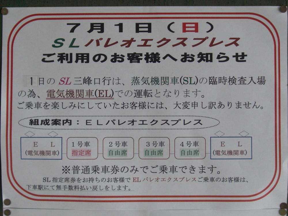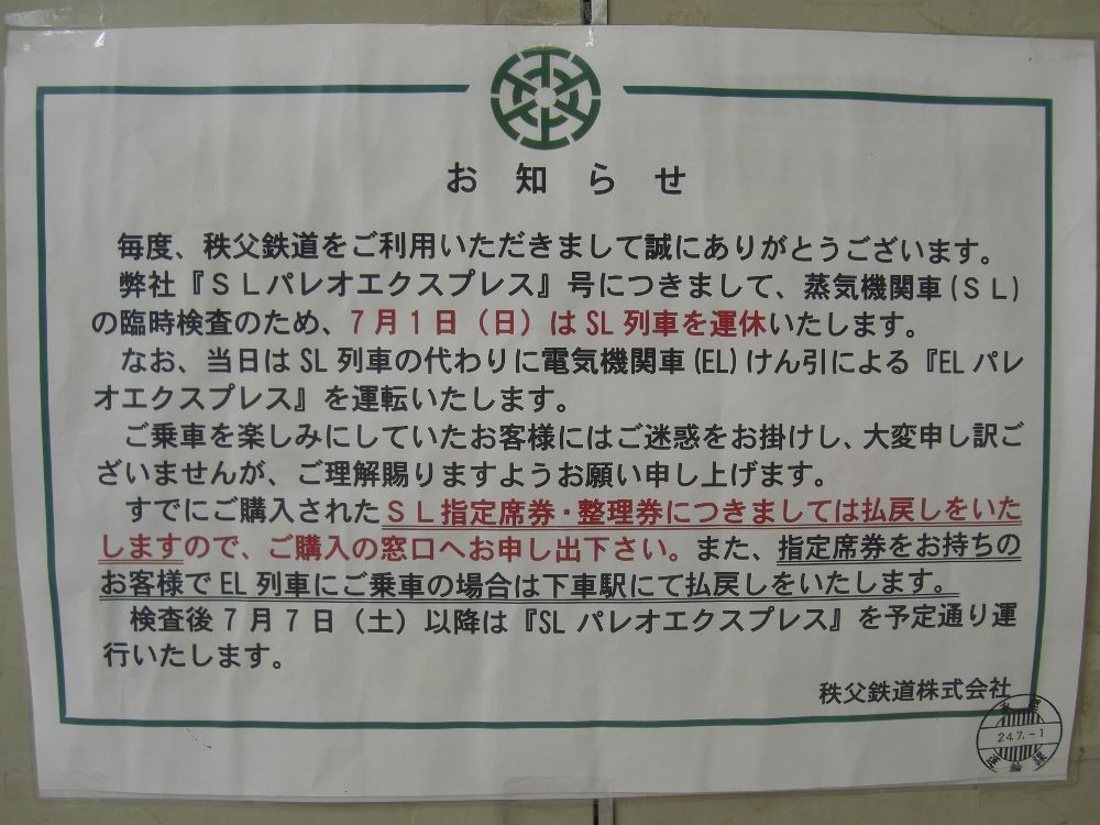 右は秩父駅改札外に掲示されていたSL運休、ELによる運行、整理券払い戻しに関するお知らせ。