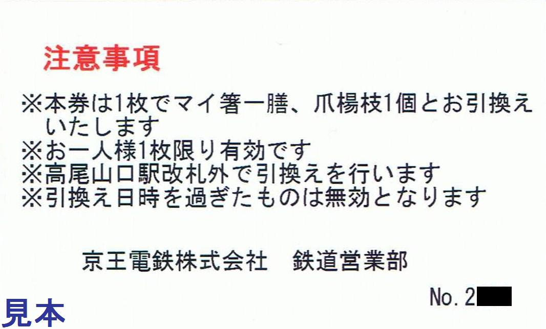 高尾山冬そば号の北野〜高尾間では乗車記念品(平成23・24年・25はその引換券)が配布されます。乗り入れ関連の記念商品等が少ない京王電鉄では貴重な乗り入れ列車関連グッズです。更に平成25年運転分は東京都交通局の乗車記念品もありました。
