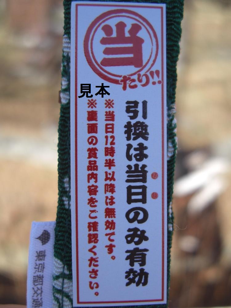 写真は車内で配布された引換券。「くじ」が無くなったため(京王電鉄が進めている仮称・高尾山温泉工事で引き換えスペースが少ないためと思われる)、前年度のハガキサイズから再び名刺用紙にプリンター印刷のものとなりました。裏面にナンバーが付いています。