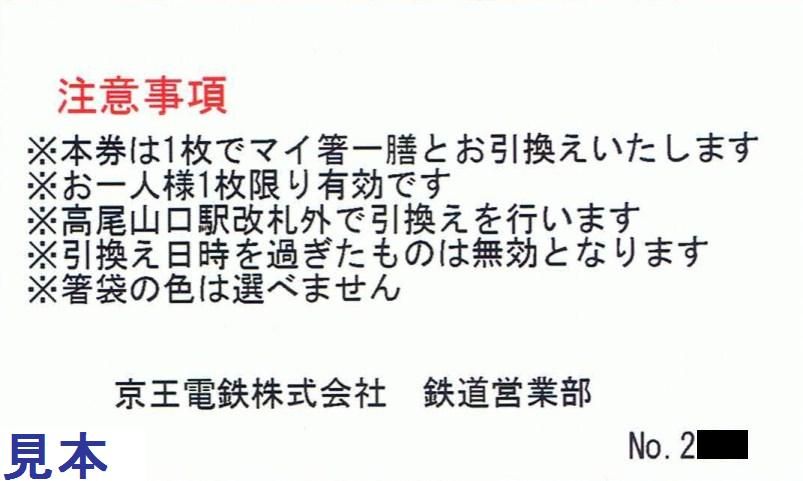 今までと異なり、車内では京王エージェンシーの方が引換券を配布し、高尾山口駅改札外で交換する方式に変更されました。私の鉄道に関する収集物の基本は切符を中心とした紙系のものなので、『券』と付くものがどのようなものかは非常に気になっていました。写真は車内で配布された引換券。名刺用紙にプリンター印刷したもので、裏面にナンバーが付いています。〔京王電鉄 2011冬そば号乗車記念マイ箸〕