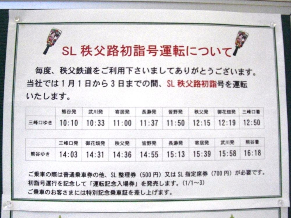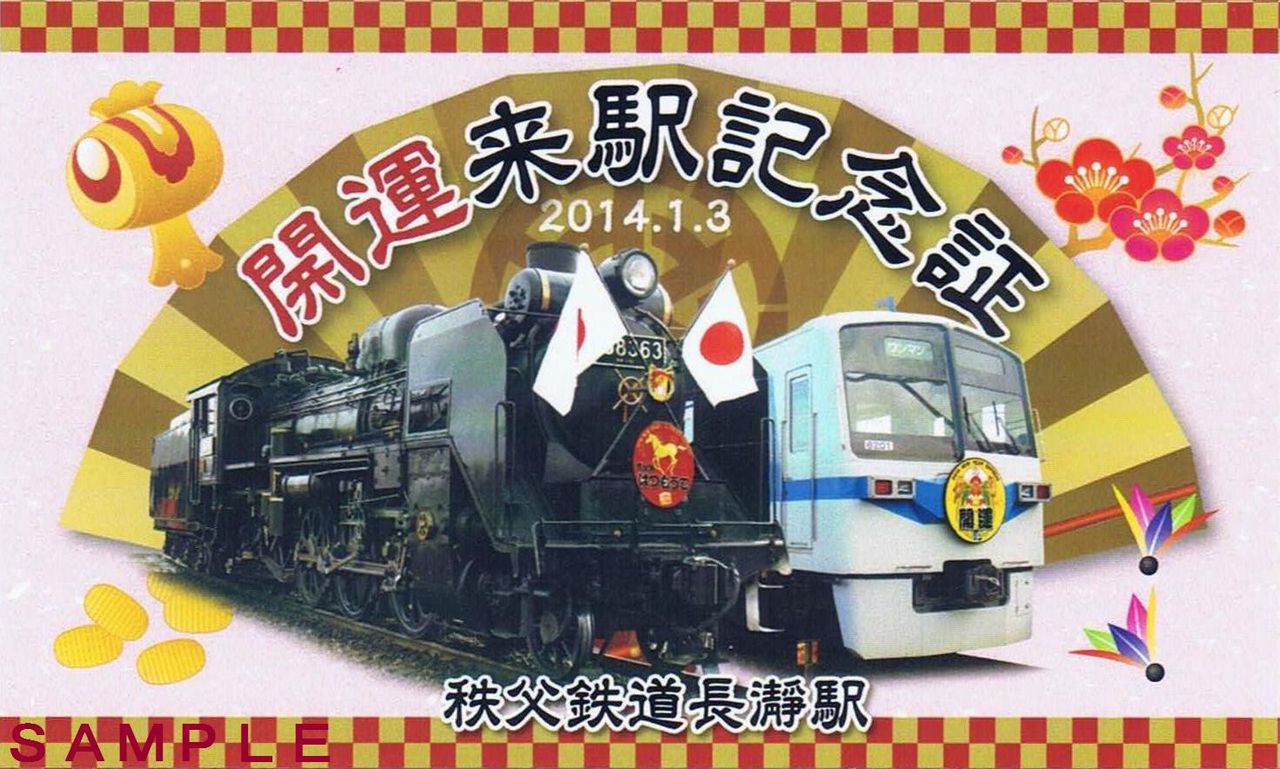 SL秩父路はつもうで号、急行開運号の運行にあわせ、同駅前で11時〜14時に開催されたミニイベント会場で配布されたもの。図柄はSL秩父路はつもうで号と急行開運号。