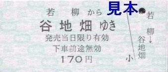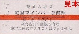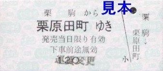 硬券乗車券については、収集日時点での有人各駅(若柳、沢辺、栗駒)発の硬券乗車券で隣駅までのものを入手していますが、栗駒駅発の細倉マインパーク前方面のみ同運賃で栗原田町と尾松それぞれありますので両方入手しています。社名変更当時(運賃改定前)の硬券乗車券は入手していませんが、栗駒から栗原田町ゆきの券が運賃変更印入りなので、当時の券の残りはこれと同様に訂正してそのまま使用されたのではないかと思います。
