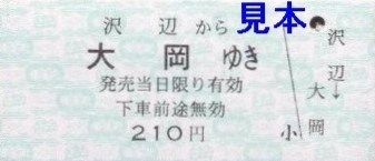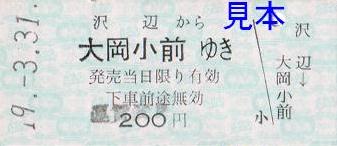 ・硬券乗車券(沢辺から大岡小前ゆき)※運賃変更印あり