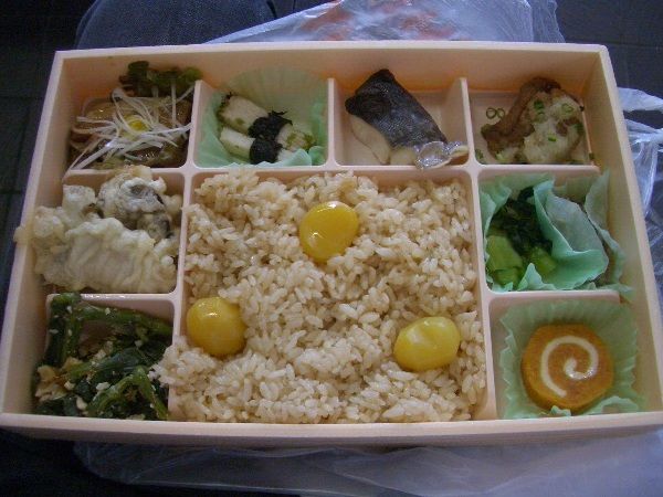 写真左はお品書き。外箱は後述の平成21年購入分との大きな違いがありませんが、当時のものにはJR20周年記念ロゴのシールが貼られていました。『くるみと菜の花の和えもの』が、平成21年購入分では『カリンコ梅』に変わっています。