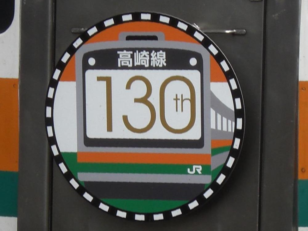 高崎線開業130周年を記念して、平成25年7月〜12月まで運転されたラッピング車両。大宮で撮影。写真右はヘッドマーク部分の拡大。