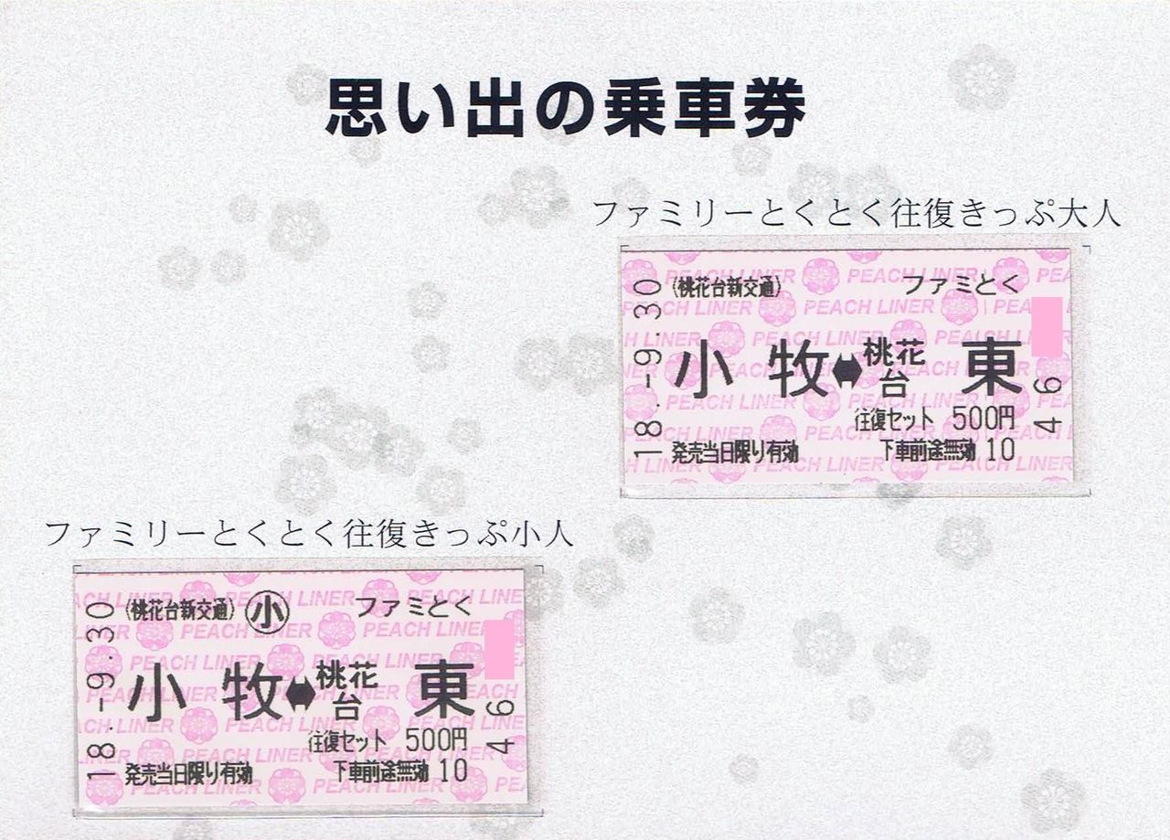ピーチライナーの廃止を記念して、特製の台紙に磁気券をセットにした記念切符を2種類(記念入場券セットと記念乗車券セット)発売しました。入場券はそれほど使用する機会がないと思いますが、乗車券については使用出来れば無駄にならずに済みます。しかし、記念乗車券セットについては台紙に『※この乗車券は、記念券ですので、実際に当社線へのご乗車はできません。』という注意書きが記載されています。