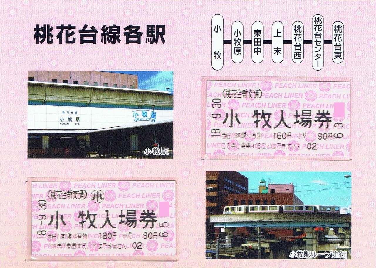 開業1周年を記念した磁気カードタイプの乗車券。台紙(写真左)と4日間有効の券(写真右)のセット。なお、台紙には『ピーチくんチケット(1日乗車券)』との記載がありますが、券面には『4まるちけっと(フォーマルチケット)』と記載されています。日付・金額まで印刷済みで、桃花台新交通の記念切符としては『かなりまとも』な券です。
