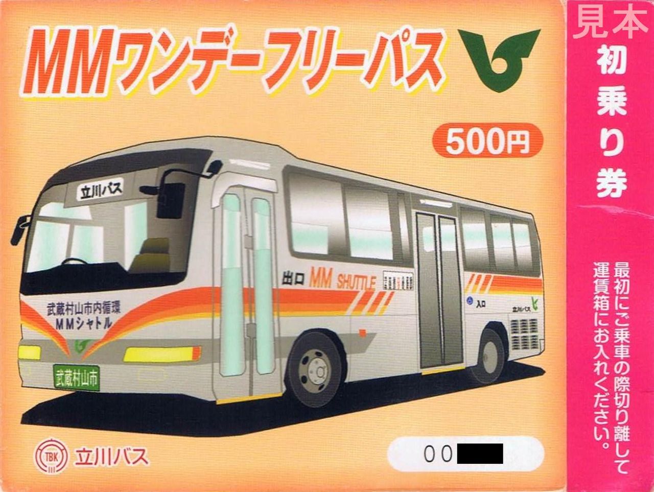 MMシャトル車内、立川バス瑞穂営業所及び上水営業所で発売しているMMシャトル専用の1日乗車券で、日付(月、日)はスクラッチ式となっています。500円。小児用の設定はありません。私はMMシャトル車内で購入しましたが、状態があまりよくありません。営業所で購入した方が綺麗なものが入手できるのではないかと思います。