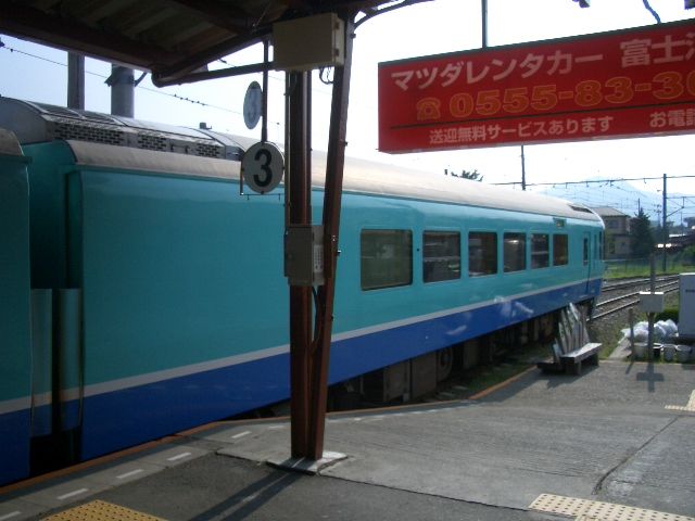 富士急行線河口湖駅の3番ホームは短く、6両編成の富士山麓夏物語号ははみ出しています(まともな写真はありません)。【関連記事】