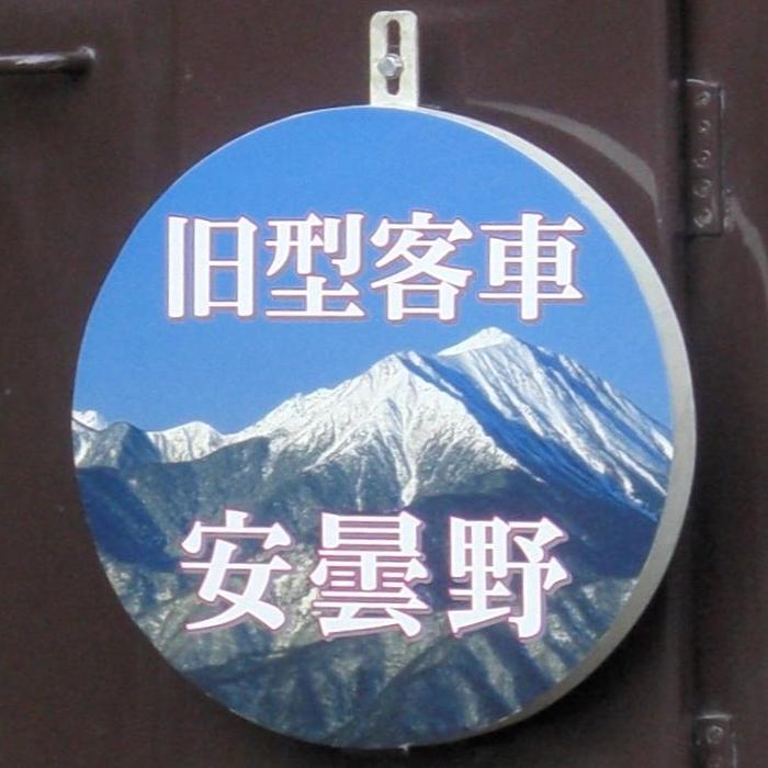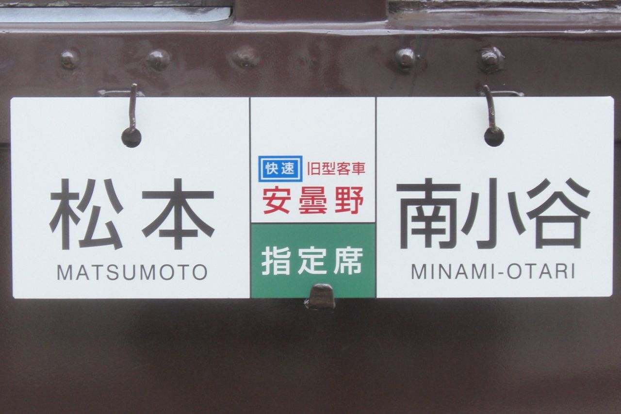 同列車のヘッドマークとサボ。1号車・3号車は大き目のサボを使用。写真のサボは1号車(スハフ32 2357)に付けられたもの。牽引機・客車は旧型客車かもしか号と同一の編成で運行。《旧型客車安曇野号(下り)》