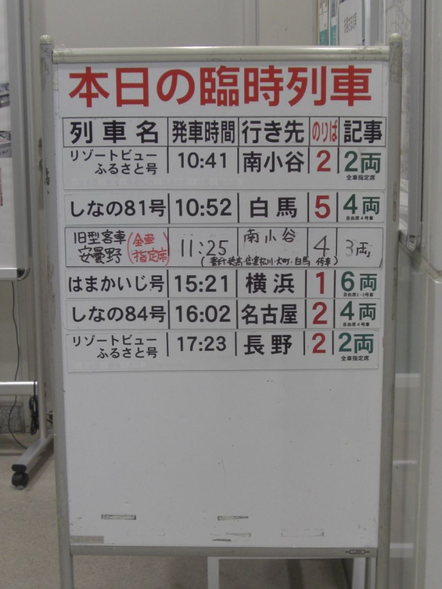 写真左は松本駅改札前の臨時列車案内。写真右上・右下は松本駅改札階の案内表示。