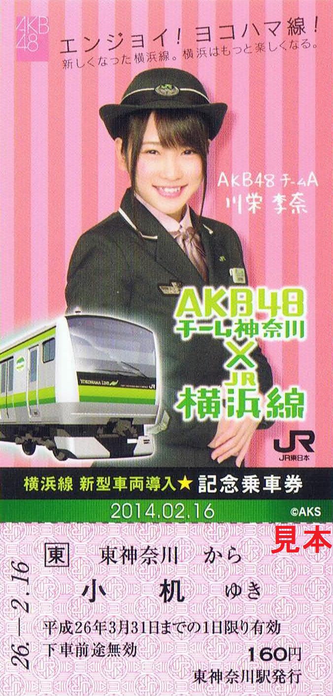横浜線のE233系営業運転開始を記念して台紙(写真左)+記念乗車券6枚セットで10,000枚限定発売。1,000円。図柄はAKB48チーム神奈川と横浜線の車両。