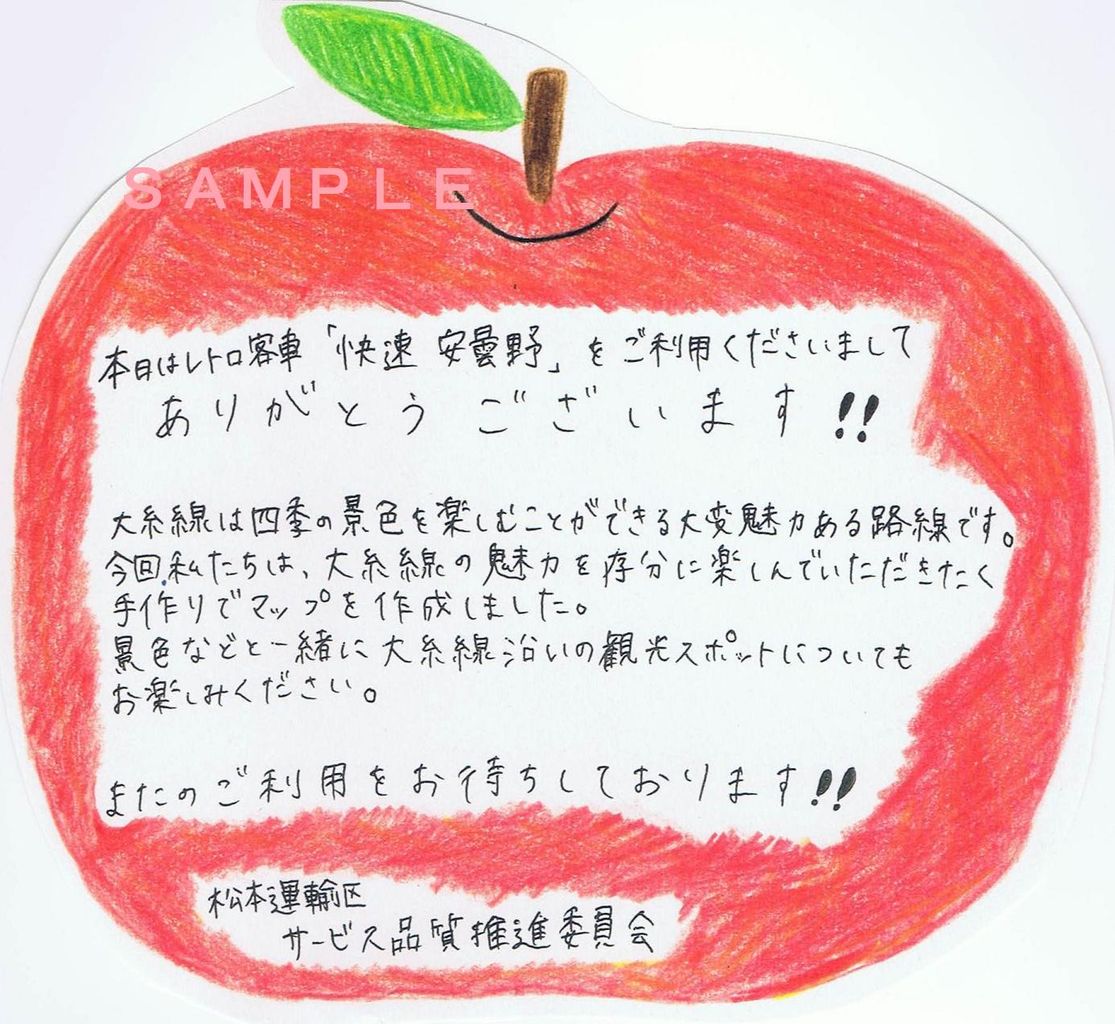 手作りマップ等のご案内で、配布品の中で唯一、列車名入りのものです。りんごの形をしていますが、手作業でその形に切り取ったようで、手間が掛かっています。――――――――――――――――――――――――――――――――――――――