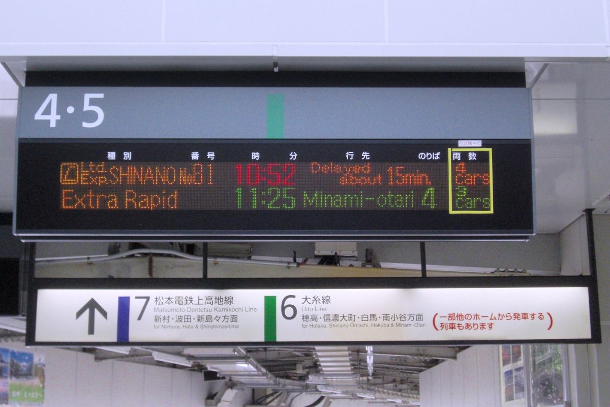 運行当日の朝に篠ノ井線村井駅で発生した人身事故により、松本駅発着の各列車のダイヤが乱れていました。この列車についても、直前に大糸線内へ向かう特急あずさ3号としなの81号が遅延しており、それらの次の大糸線普通列車(4327M)の出発を待って、松本駅を12:06に発車しました(41分遅れ)。その後は本来の停車駅での停車時間を短縮する一方で、停車駅以外での対向列車交換待ちや先行する4327Mの先の交換駅への到着待ちによる運転停車があり、終点・南小谷駅には14:20に到着しました(40分遅れ)。