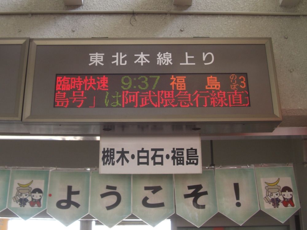 福島行きの到着時には駅前広場で伊達市の歓迎イベントが開催されていました。今回もA417系を並べましたが、ジパングによる運行が珍しかったからか撮影者が多数。人の入らない並びでの撮影は難しかったと思います(私は諦めました)。前面の行先表示は入線時に『回送』。その後は『郡山』と表示。貴重なシーンです。なお、前回同様、駅舎の反対側の線路を渡ったところが撮影場所として開放されていました(がんばろう宮城福島号の福島行き停車時のみ)。