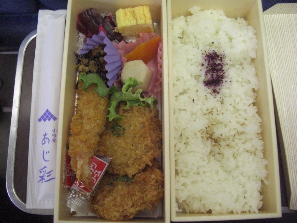 調製は株式会社丸高の駅弁ブランド『小田原あじ彩』。メインのおかずはひれかつとエビフライ。同社は食肉業務用卸もしているのでひれかつは肉厚で美味しいです。