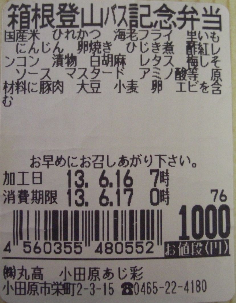 これは100周年記念弁当で税込1,000円。平成25年6月15日予約・16日受け取りの方法にて箱根湯本駅構内の『箱根の市』で購入。ここ以外に小田原駅前名産店でも取り扱いがあるようです。