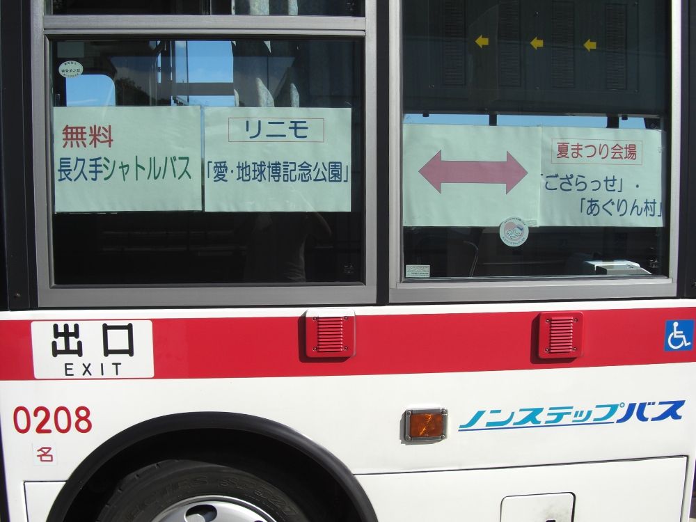 長久手町(当時)まちづくり推進部まちづくり協働課では平成20年の7月中旬〜8月下旬の土日祝日にリニモ愛・地球博記念公園駅〜長久手温泉ござらっせ・あぐりん村間に無料シャトルバスを運行しました。バスの運行は名鉄バスが担当。リニモの利用促進策としての運行でした。