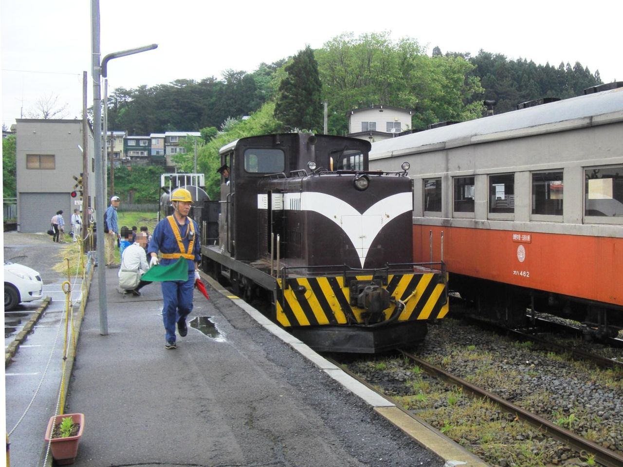13:10頃から撮影会のため車庫に繋がる側線に展示されていた車両を、臨452レ用に組成変更するため入れ換え作業を開始。津軽21形走れメロス号が客車を構内終端部分まで引き出す。