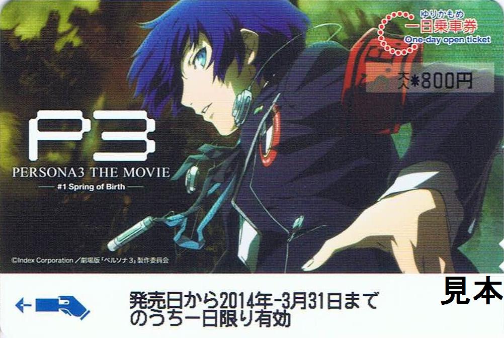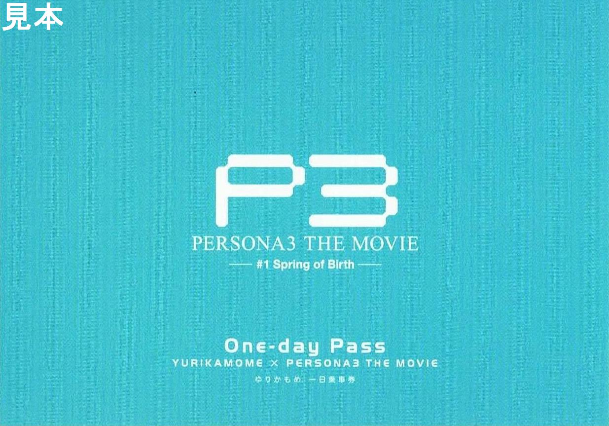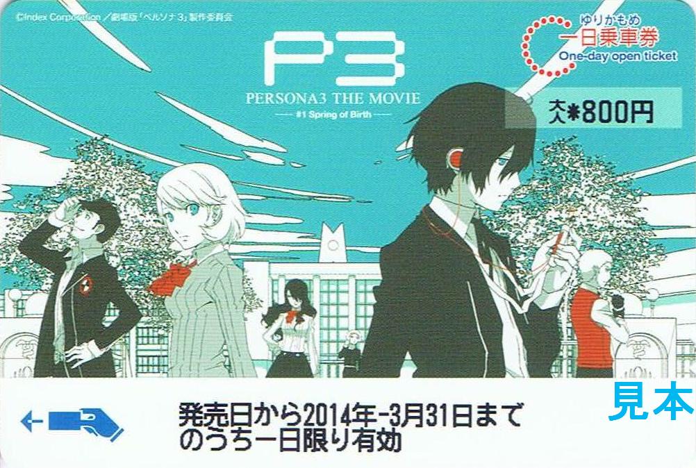 映画『劇場版 ペルソナ3 #1 Spring of Birth』デザインの記念一日乗車券でデザインA、デザインBの2種類(台紙付きで大人用800円)。合計3,000枚を新橋駅、豊洲駅の駅長事務室で発売。