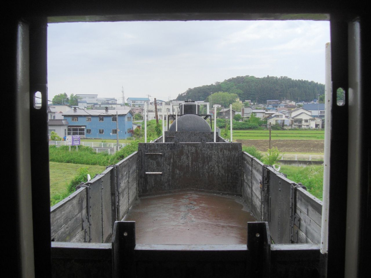 臨452レは、一部の駅を通過する準急列車として運行。津軽中里駅での組成変更作業に時間が掛かり、定刻より数分遅れていました。写真はオハ462から後部の貨車を撮影。