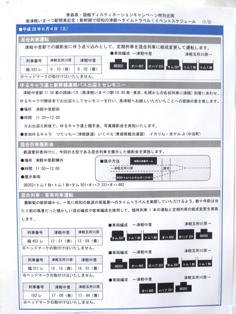 左はイベント開催のお知らせ。右はつてっちーからのお願い。収集鉄・乗り鉄は当然買っている筈。鉄橋周辺等の撮影地では撮り鉄の方々が見られましたが、ちゃんとフリーパスは買ったかな?《混合列車の使用車両(外観は津軽中里駅構内側線で撮影)》