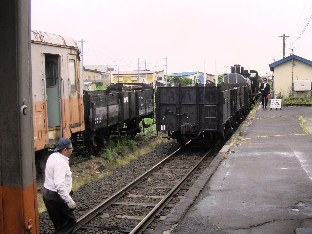津軽五所川原駅では、3番線に到着した臨452レを、臨311レ用に組成変更。貨車から順番に、一旦、津軽中里寄りに移動後、4番線に移動させて組成変更しました。写真は2枚とも3番線で撮影。写真右の左側に写っているのは、トム1と既に廃車となっているキハ22形。