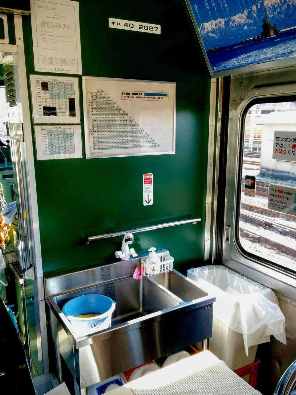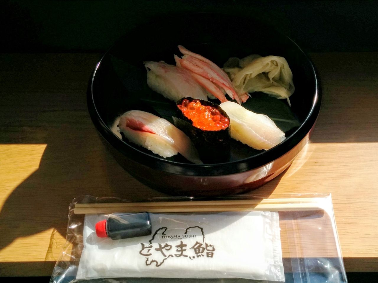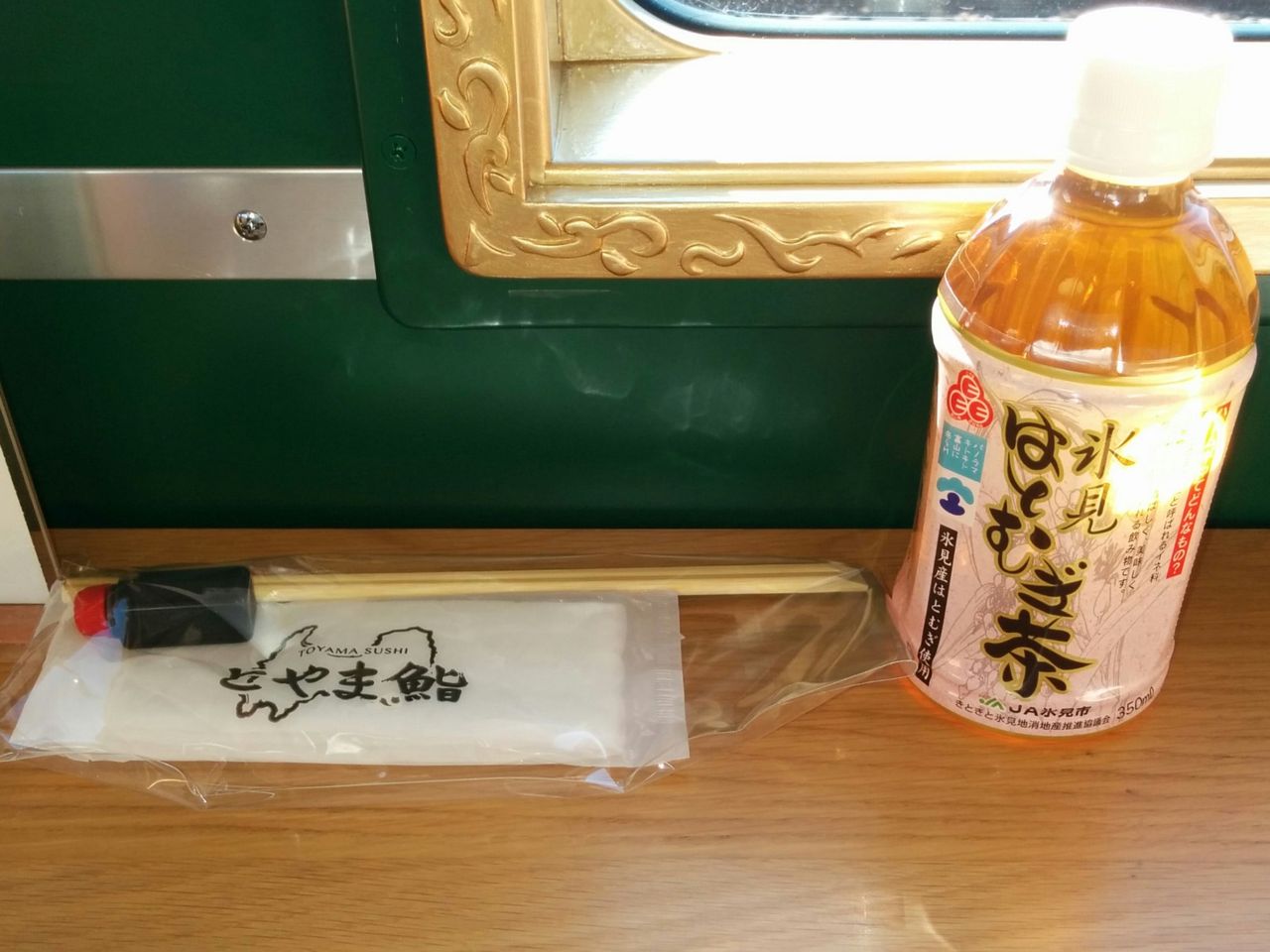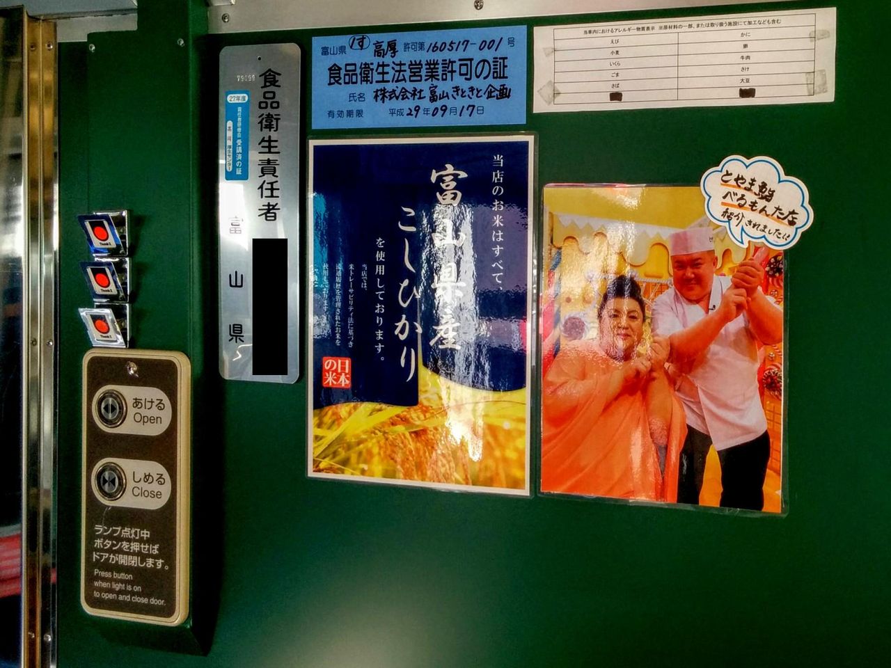 この列車には寿司職人の方が乗車しており、車内で握りたての鮨が食べられます。富山県内にチェーン展開する『とやま鮨』が、『とやま鮨べるもんた店』として営業しています(後ろの写真欄を参照。車内にそう掲示してあります)。