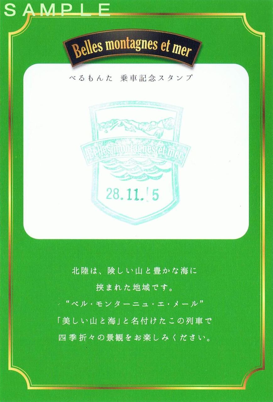 べるもんた氷見2号の指定席券については首都圏のMVにて確保していましたが、1号のみ(今回の乗車日に限らず何時でも)直ぐに満席になる傾向があるようで、当日朝の首都圏MVでも確保出来ないまま新高岡駅に到着。みどりの窓口で尋ねたところ、数席空きあり、との事。意外と出発直前に出てくるものです。車内では希望者に後述の記念乗車証用とは別の小型スタンプを用意しています。花嫁のれんと同様のサービスです。