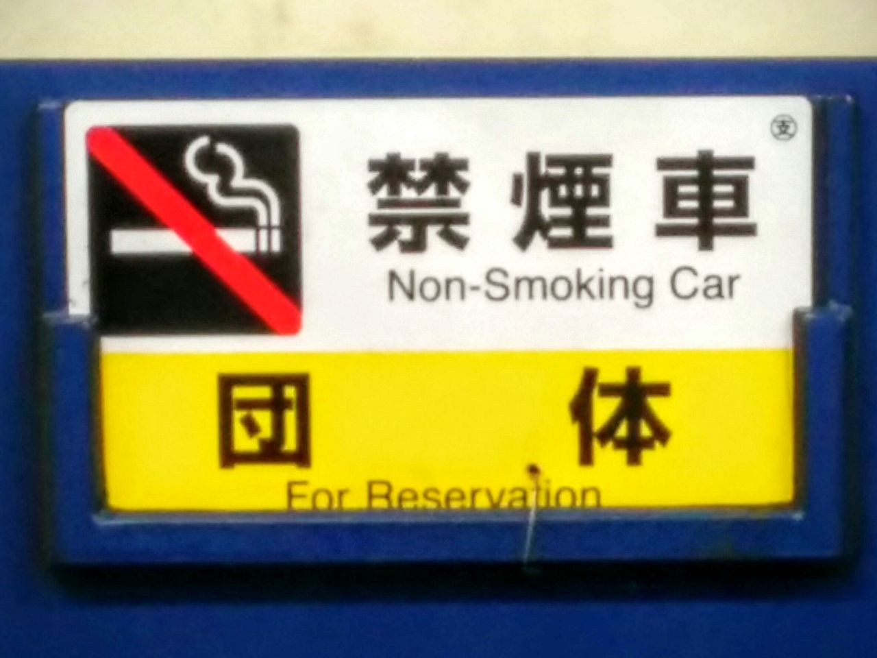 写真左は車内。写真右はサボで「禁煙車/団体」の表示です。禁煙車というのが現代的過ぎで、昭和っぽくないです。