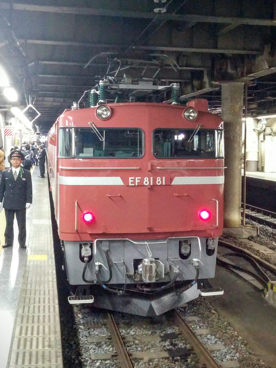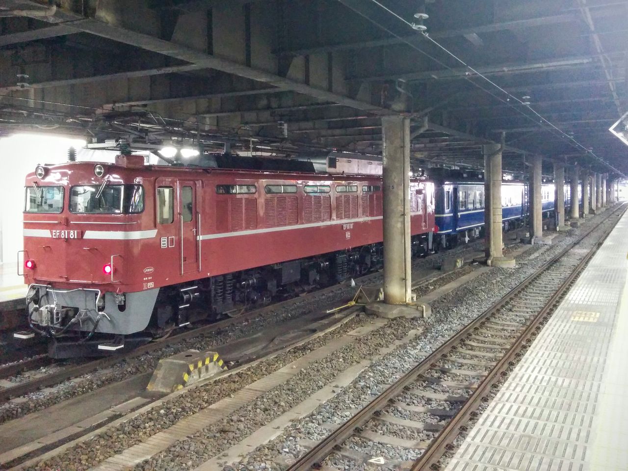 上野駅で回送待ちのEF81形電気機関車2と12系客車。