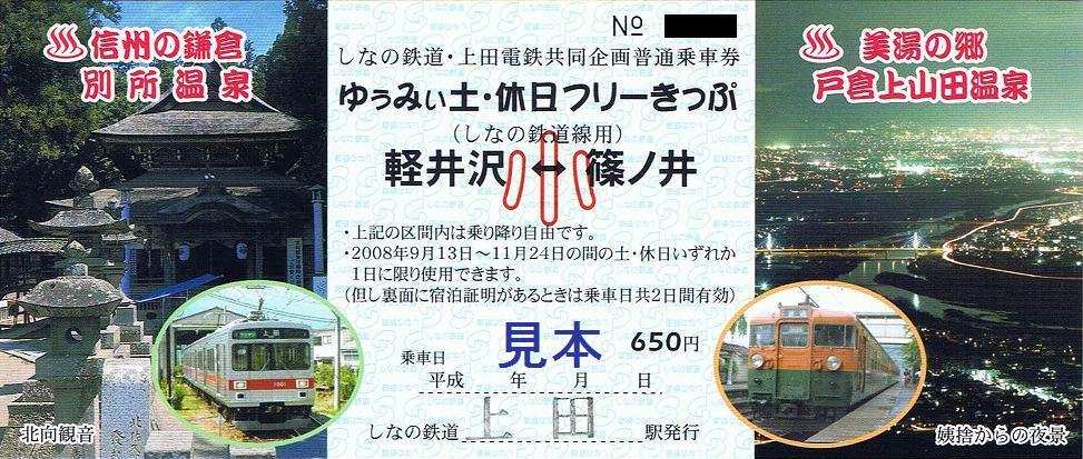 平成18年9月16日から発売中。しなの鉄道線内で土休日に有効のフリー切符で、昨年の上田電鉄発足時に同社と共同企画で発売したものに続き、今回が第2回目。