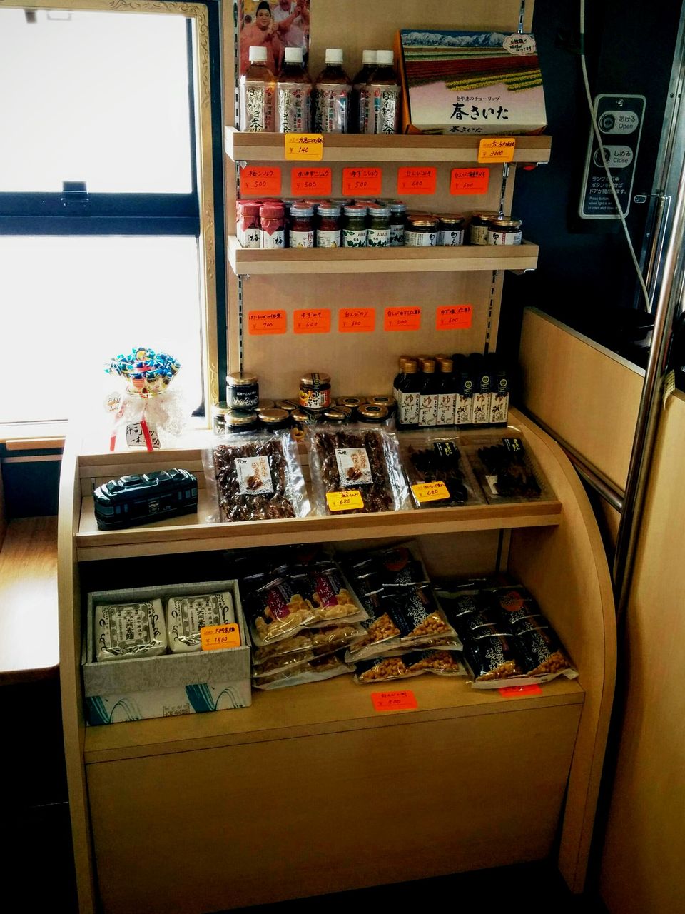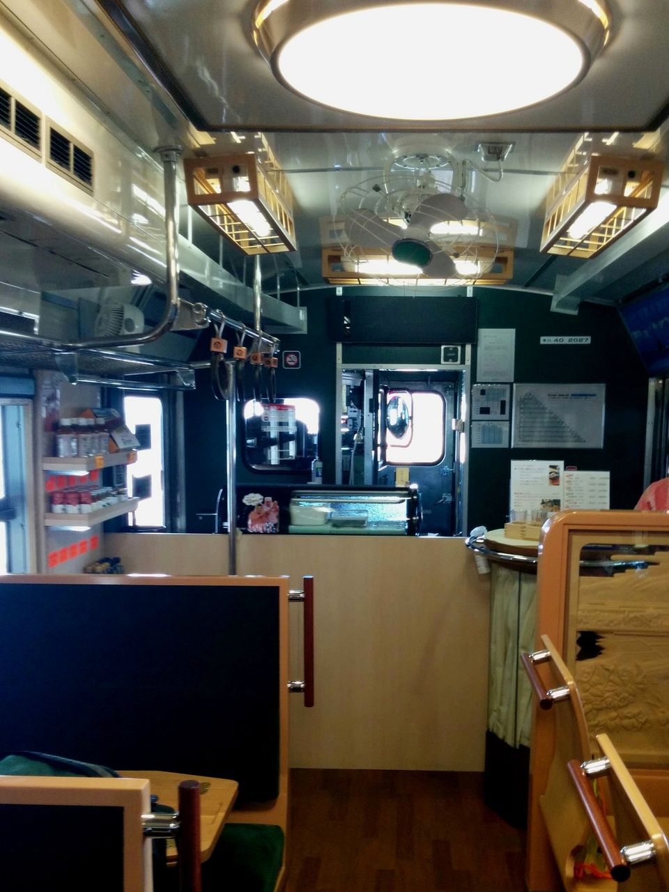 車端部に設置された土産品の商品棚と寿司カウンター。