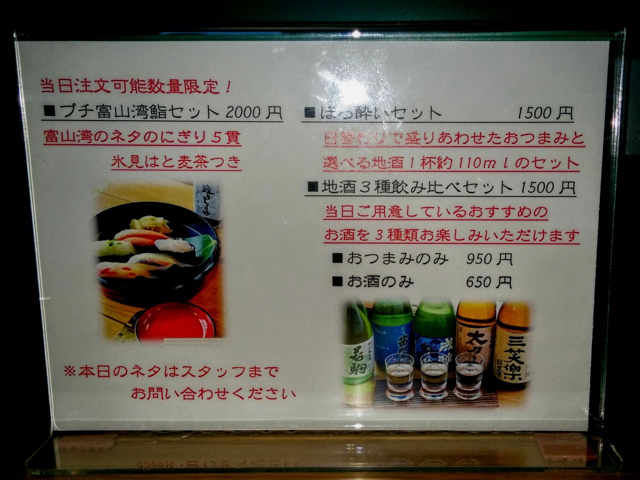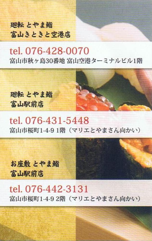 今回は事前予約(3日前まで)せず、当日購入(数量限定)にてプチ富山湾鮨セット(税込2,000円)のみ注文しました。普通の飲食店と変わらず、その他レストラン列車の様なお品書きはありません。寿司カウンター周辺にとやま鮨の名刺が置いています(写真)。