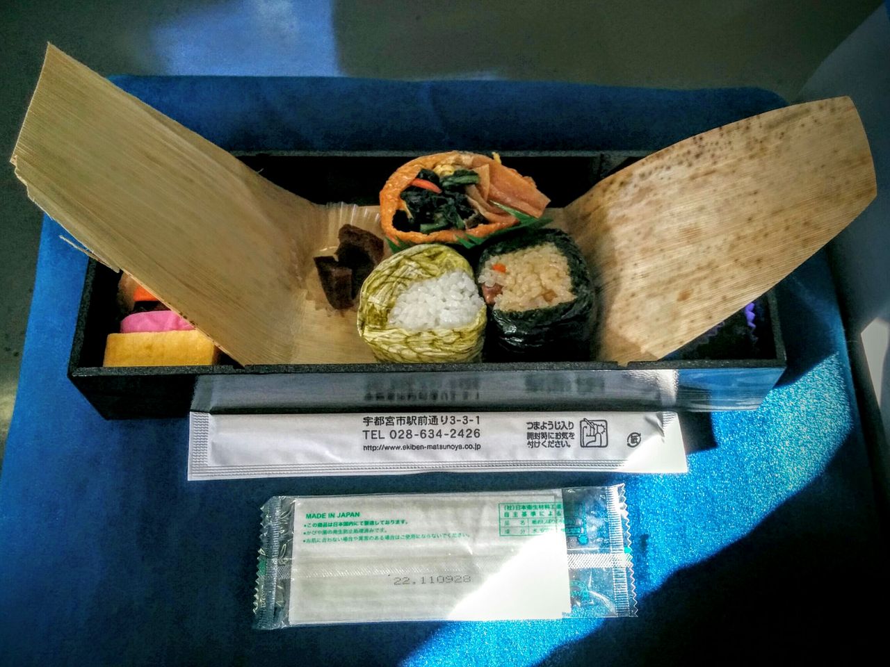 宇都宮の駅弁業者・松廼家調製の特製弁当です。写真は掛紙。駅弁発祥地に因み、竹皮で包んだご飯、稲荷ずし、ギョーザなど宇都宮駅弁らしさが表現されています。