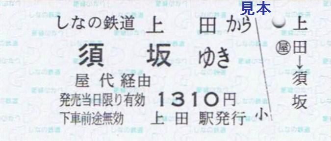 しなの鉄道が発行した屋代線廃止記念乗車券2種類のうちの1つ。しなの鉄道線上田駅から屋代経由で長野電鉄屋代線須坂駅までの連絡乗車券です。裏面はもう1種類(屋代から須坂ゆき)と同じ記載内容です(当ブログ長野電鉄 屋代線をご参照下さい)。