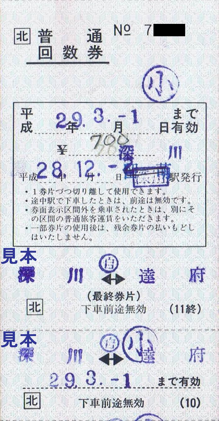 《深川駅発行 普通回数券(2016年12月2日収集)》