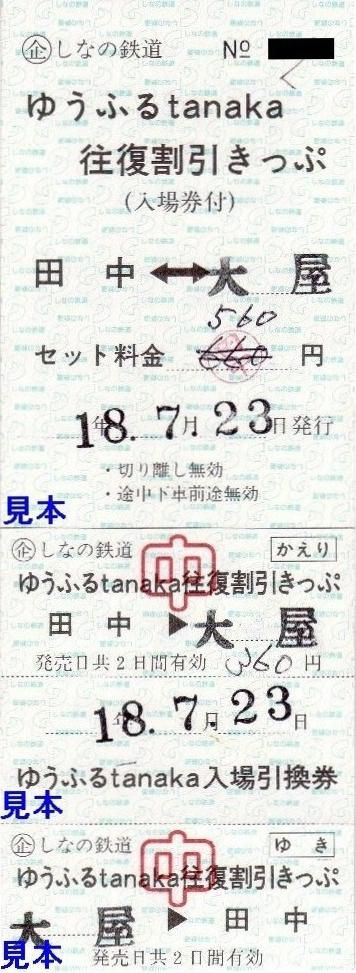 ゆうふるtanakaはしなの鉄道線田中駅前にある信州東御市振興公社運営の日帰り温泉(プールもある)で、私も列車待ちの間に入浴しました。駅前で便利なのでマイカー以外に列車で来る人も数名みかけました。これからもしなの鉄道と沿線自治体や関連する公社等とが連携した様々な企画を期待しています。 ところで、訪問時には同館がオープン7周年を迎え、それを記念して翌月中旬まで入館料がキャンペーン価格となっており、しなの鉄道発行のゆうふるtanaka往復割引きっぷも通常販売価格より大人200円引き、小中100円引きのキャンペーン価格での販売となっていました。大屋駅では中人用と大人用には事前に通常価格が書き込まれていたのでボールペンでの訂正となっていました。