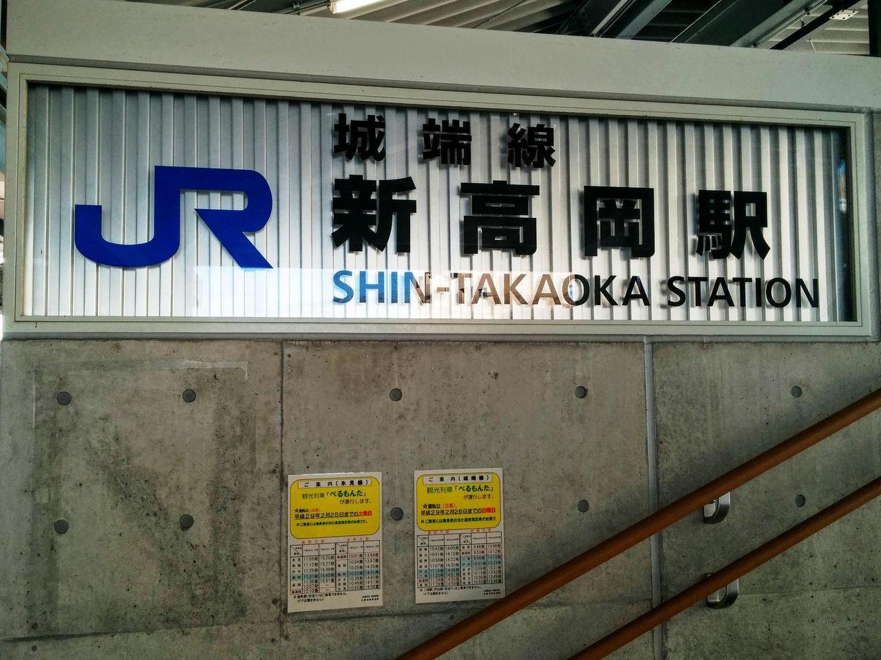 べるもんた1号始発駅の城端線新高岡駅は、北陸新幹線と異なり1面1線の無人駅です。この列車は城端方面から入線します。