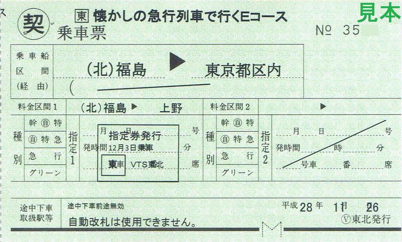 車内イベントとして、添乗員による懐かしの改札鋏による車内検札が行われましたが、そのためか乗車票は常備軟券が発行されました。(○囲み)V東北発行。最近のツアーでは珍しいような。乗車駅・コース名等は印刷済ですが、何種類あるのだろうか?