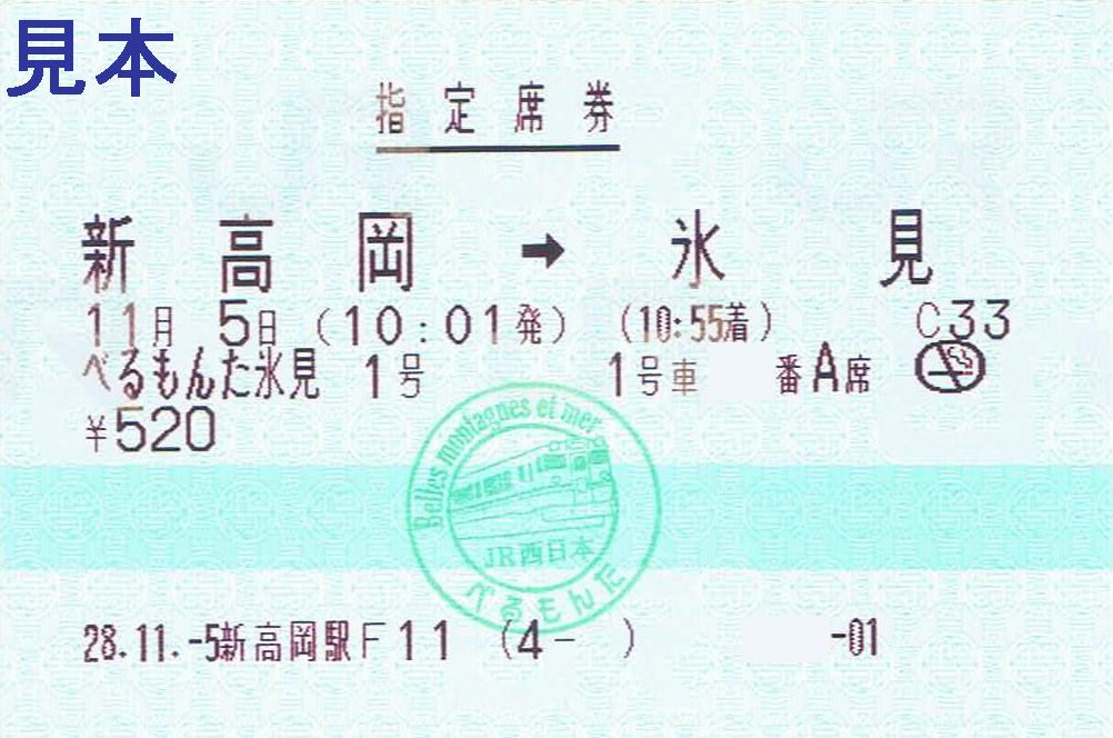 《新高岡駅みどりの窓口発行 べるもんた氷見1号 指定席券(2016年11月5日)》