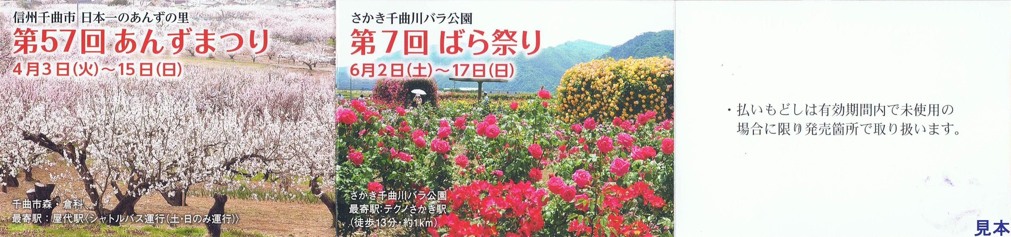 小児用は断線で切っての発売となります。沿線の花関連の祭りの写真と予定日を図柄にしたフリー切符。6月までの予定しか記載されておりませんので、それ以降に新しい図柄の券が発売されそうな気がします。