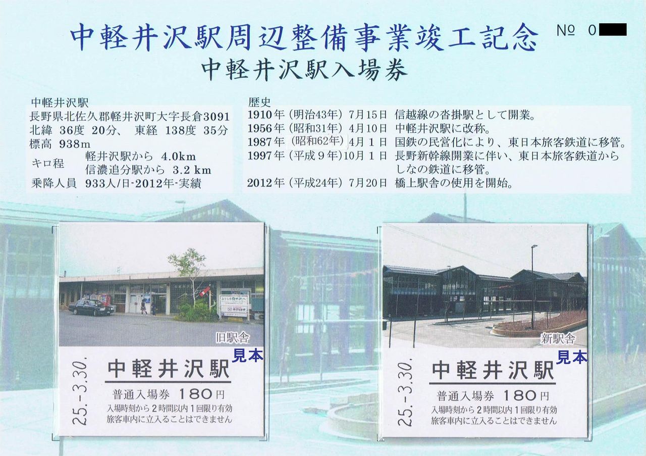 中軽井沢駅舎と接続された地域交流施設『くつかけテラス』等の竣工による、整備事業全体の竣工を記念して発売。台紙にC型硬券入場券2枚のセット。デザインは旧駅舎と新駅舎。