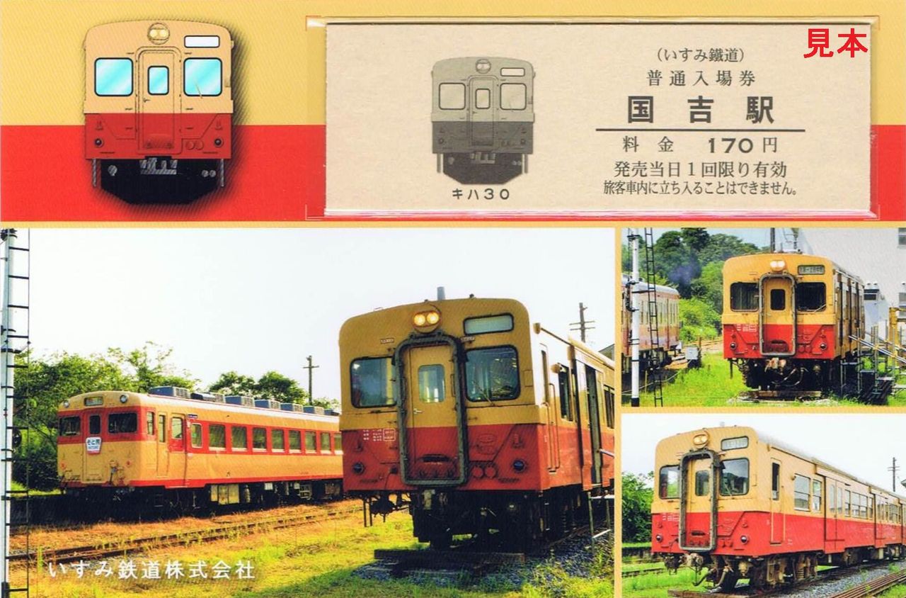 平成28年の夏に登場した新デザインの硬券入場券です。今回も台紙付きD型硬券・3種類ですが、国吉駅のものがキハ30デザインです。