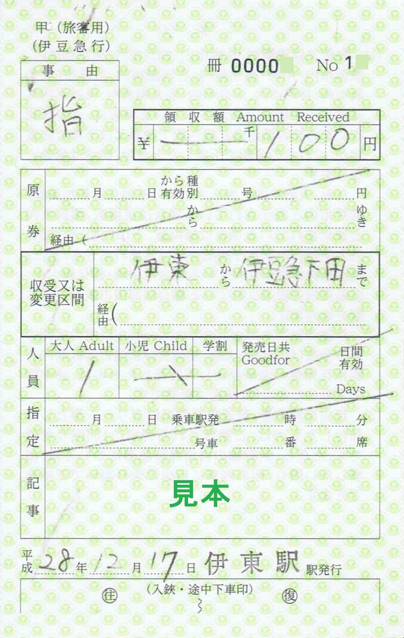 快速・伊豆初日の出号の指定席券です。以前は同駅発行の伊豆急行線内踊り子号グリーン席特急券が補充券で発行されていましたが常備券に変わりました。さらに平成28年7月に登場した快速・IZU CRAILE(伊豆クレイル)(下記リンク記事を御参照下さい)についても、伊豆急行線内普通・快速グリーン券が常備券となり、補充券の発売機会が減っています。なお、平成18年に踊り子号グリーン席特急券として補充券を収集しています(当ブログ伊豆急行 踊り子号(JR東日本所属車)に掲載しております)が、表面は券番のフォント、全体の文字の大きさ、枠の太さ、裏面の記載内容に変化があります。