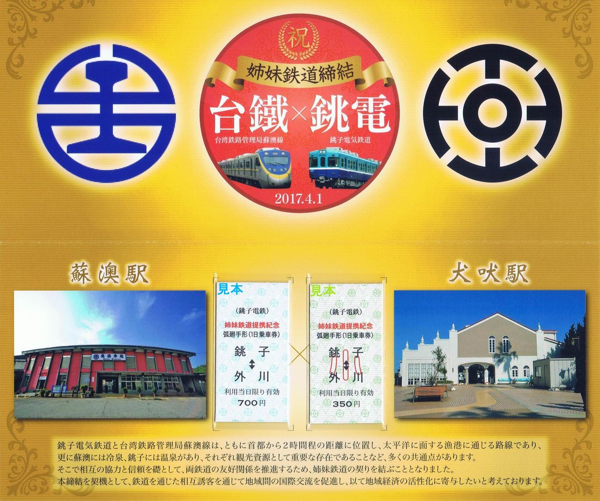 2017年4月1日より台湾鉄路管理局蘇澳線と姉妹鉄道提携しました。その記念として大人用・小児用のB型硬券の弧廻手形2枚セットの記念切符が発売されました。台湾の乗車券風に縦型となっています。500セット限定発売。ほくそう春まつり会場の銚子電気鉄道ブースにて収集しました。