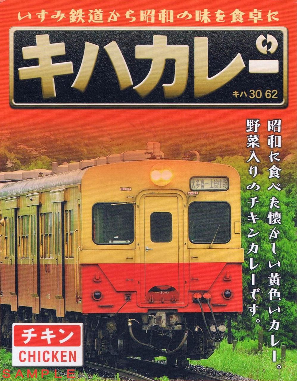 平成26年にはキハ30デザインのパッケージに入ったチキン味も登場しました。平成26年7月21日に運行された『カレー列車』では車内で食べられ、その際にパッケージが記念に渡されました。