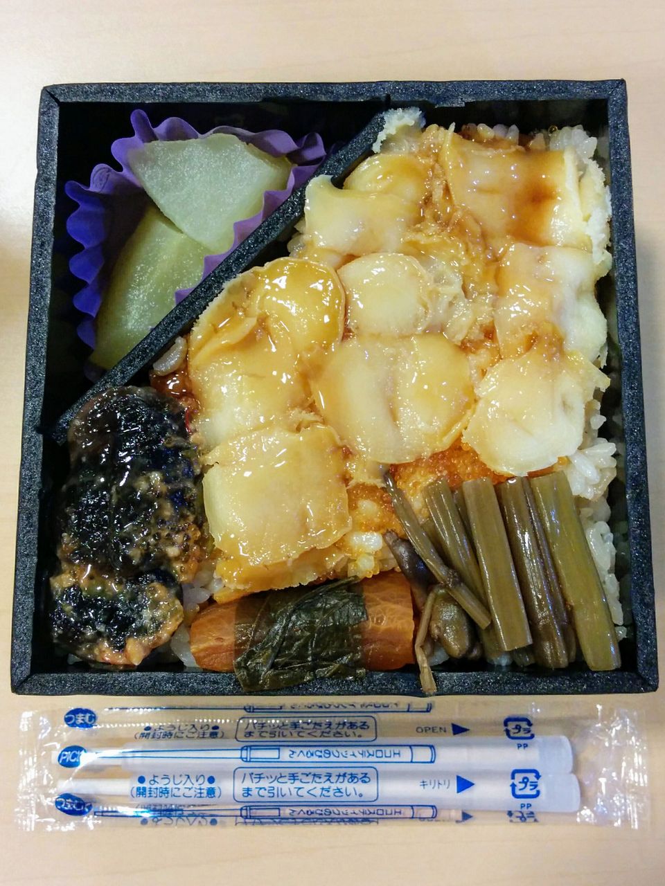 帆立のバター焼きがメイン。これは軽く焼いた感じで生に近い食感が味わえました。一方で味付きタコはパサパサした感じ。帆立の様な調理法だったら良かったと思います。《秋田駅弁 関根屋 白神浪漫(掛紙リニューアル・2013年2月14日購入)》